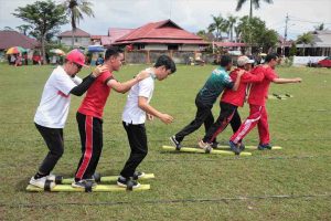 Bakiak adalah permainan yang biasanya di mainkan secara kelompok. Satu kelompok harus mengenakan kayu panjang yang diberi karet pada kakinya secara bersamaan. Kemudian pemain harus melangkah hingga garis akhir.